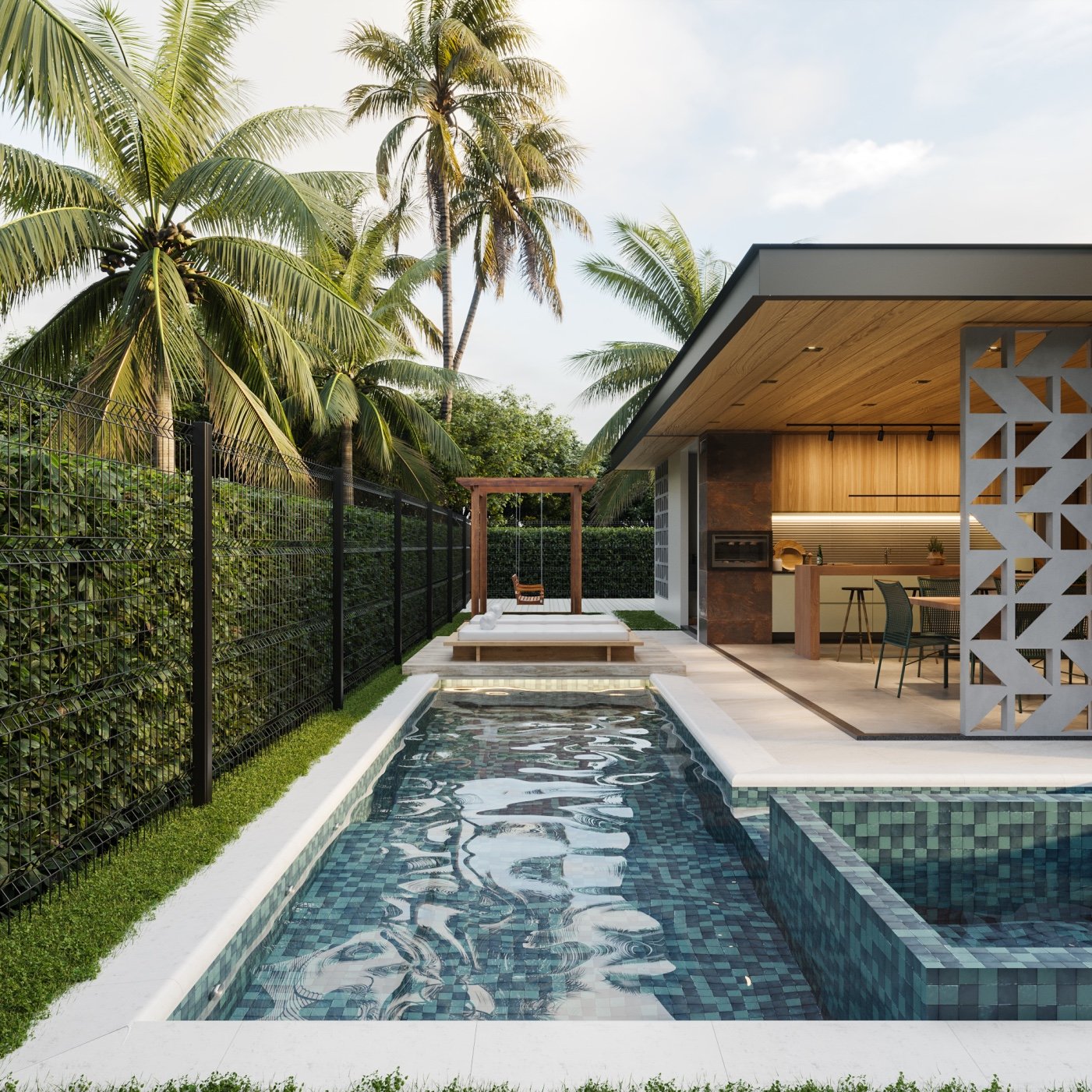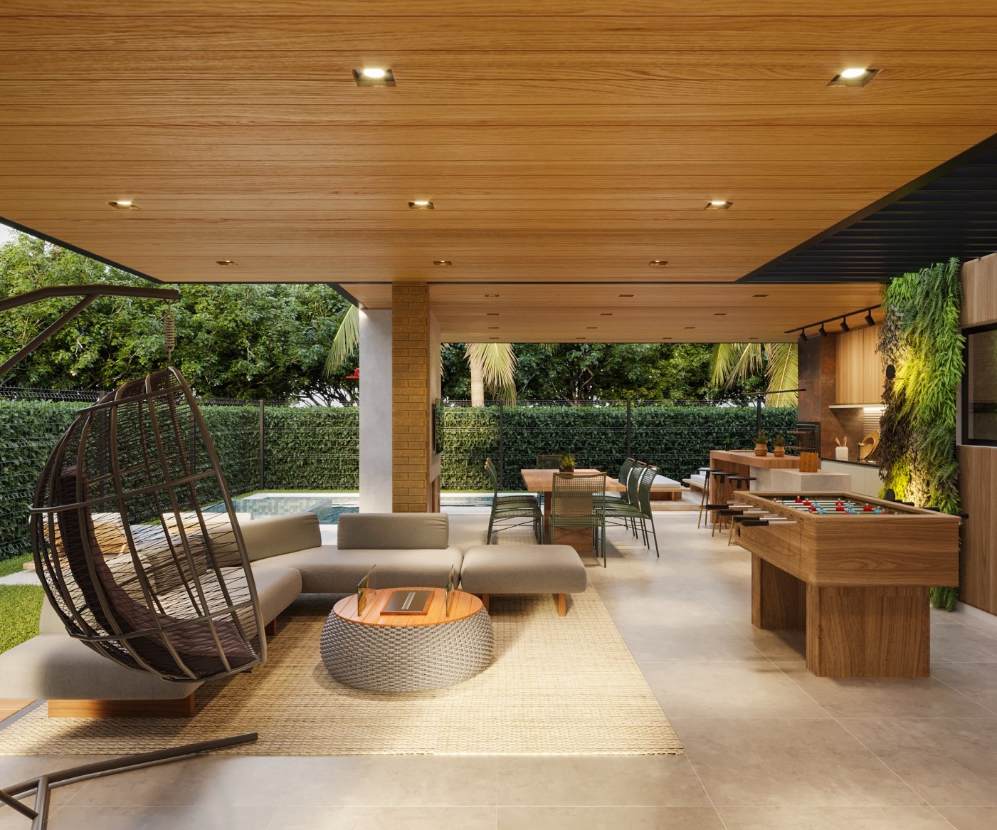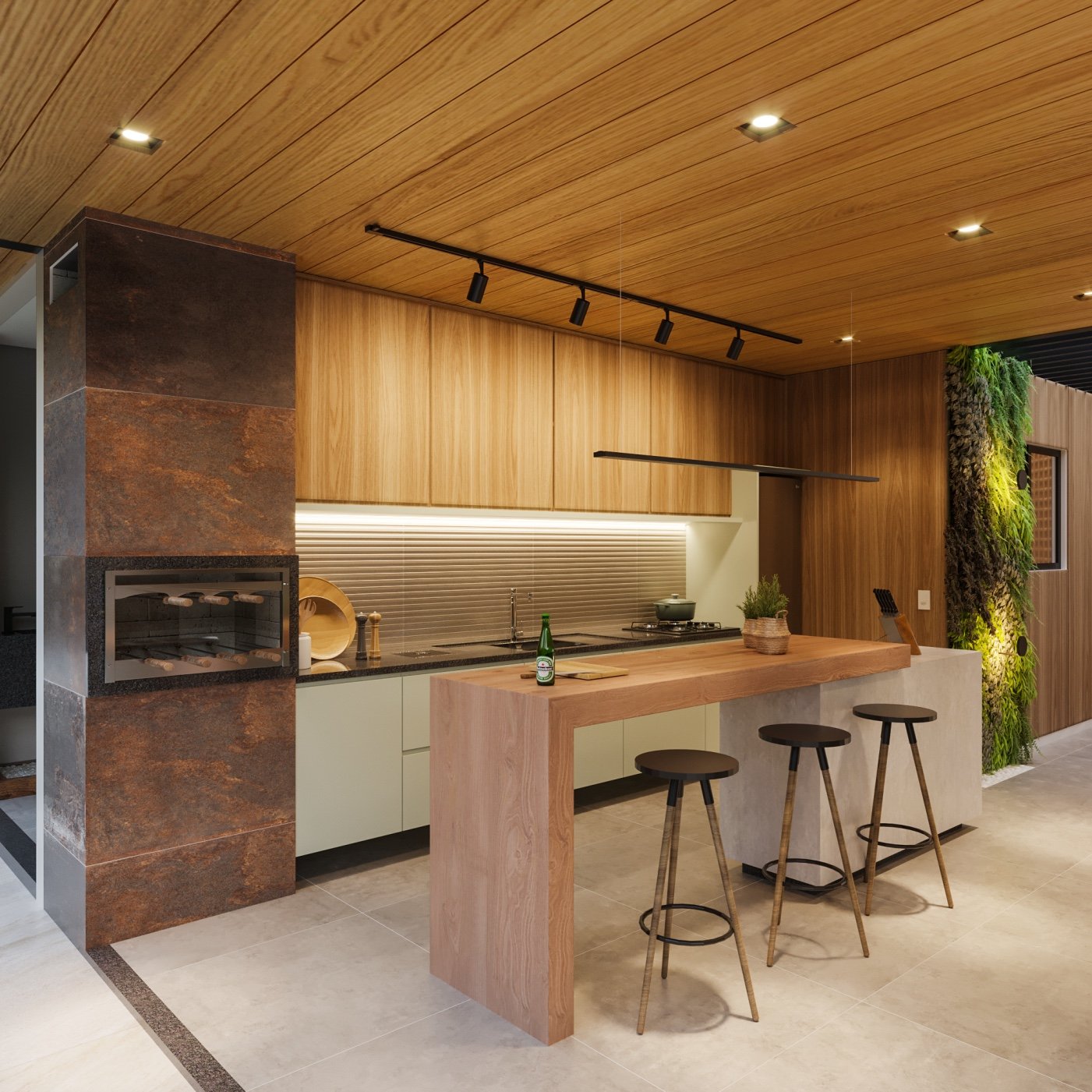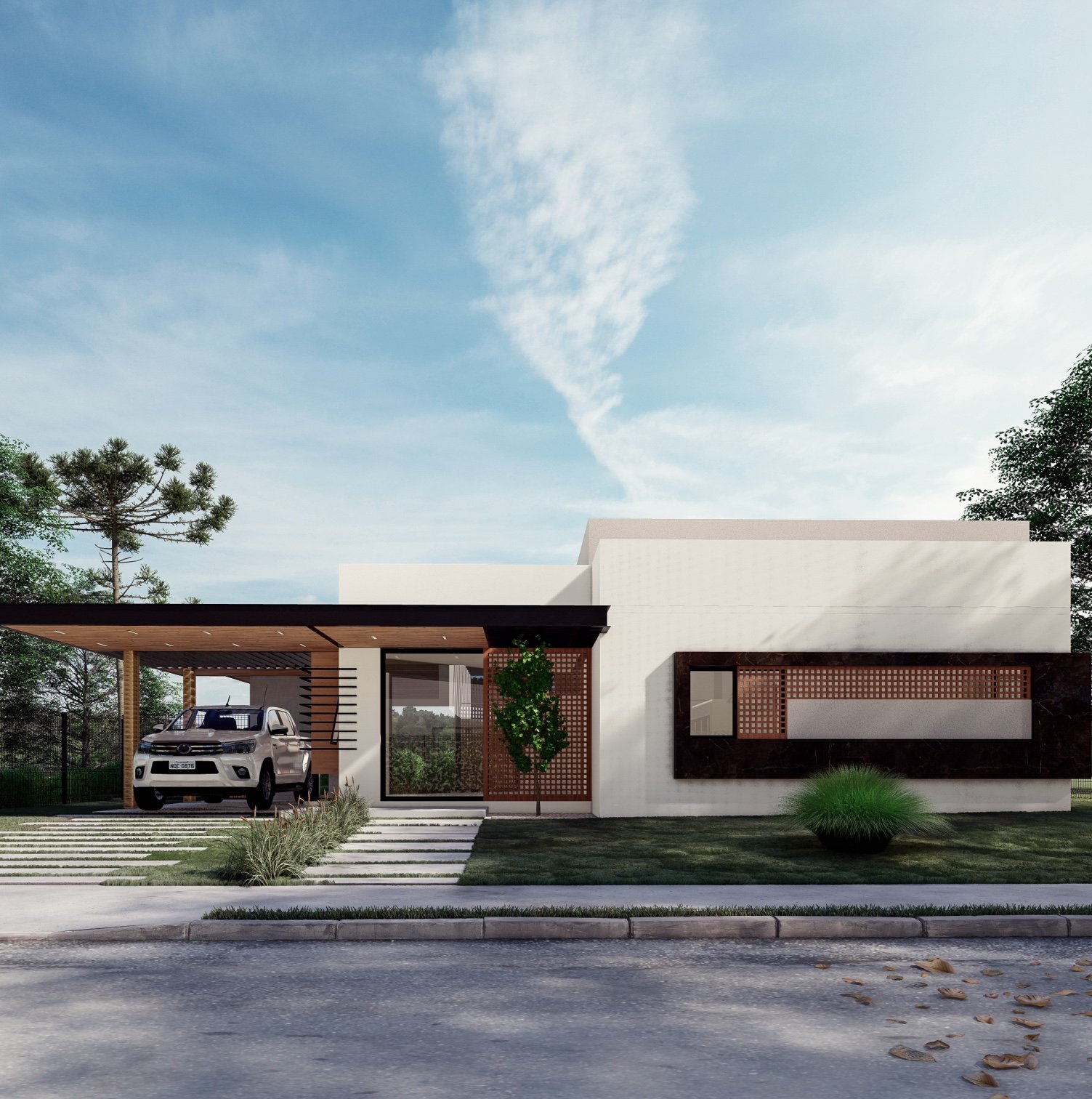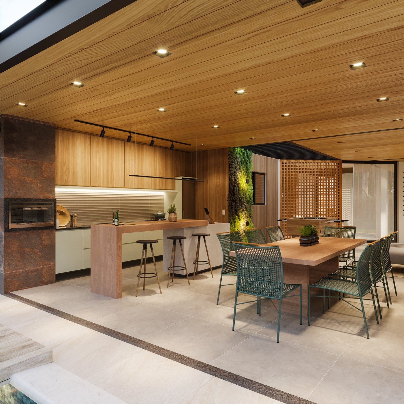 CASA DE VERANEIO J&E O refúgio da família apresenta uma arquitetura contemporânea, com materiais e elementos naturais que se integram à edificação, criando uma estética aconchegante e sofisticada.